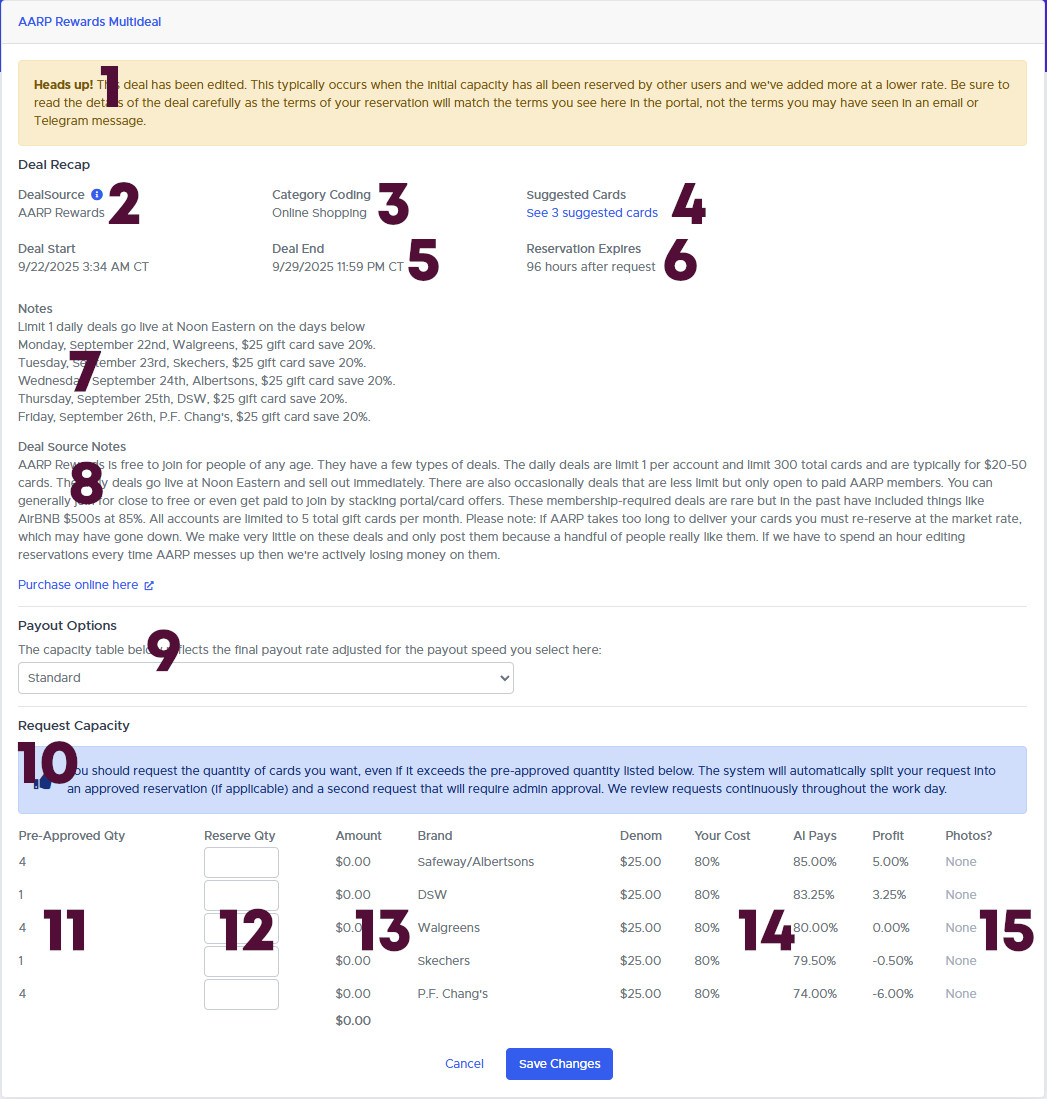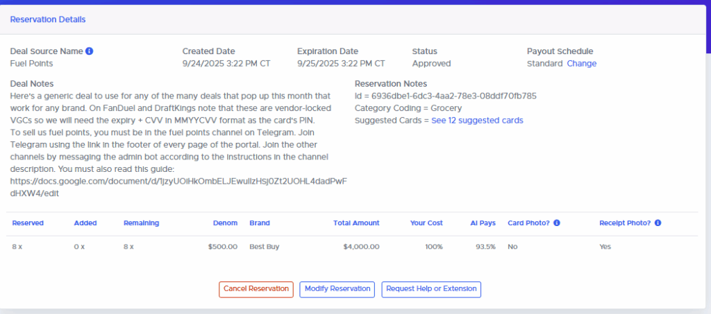 To give more people a chance at the best rates, every line of a deal has a user limit defined and you can see it when you’re creating a reservation. If you exceed it your reservation will be split into an approved reservation up to your limit amount and then into a pending reservation for the overage. During business hours, if your reservation is pending for user limit reasons, we will likely approve it in 1-2 hours if the rate has not gone down. User limits reset at midnight Central and they also increase as you submit gift cards you’ve already reserved so you’re encouraged to submit as you go and create additional reservations as needed.