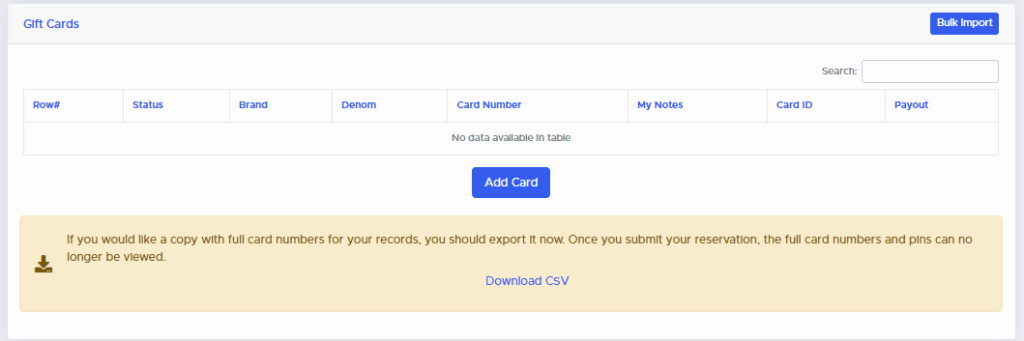 Some users (ones who didn’t read this guide) get the incorrect impression that once they submit anything into a reservation the reservation disappears. That is not so! You are not required to fulfill an entire reservation all at once. If you had a $10,000 reservation, for example, you could submit $1,000 each day, as you process the cards. If, for example, you submit $5,000 on Sunday and $5,000 on Monday, the cards you submitted on Sunday will be paid one week before the cards you submitted on Monday, as the pay period is based on when the card was sold to us, not when the reservation was totally fulfilled. We encourage you to upload cards as you go. Once you’ve added cards to a reservation there is no reason not to submit right away, you can always submit more tomorrow (assuming your reservation has not expired and you still have capacity reserved).