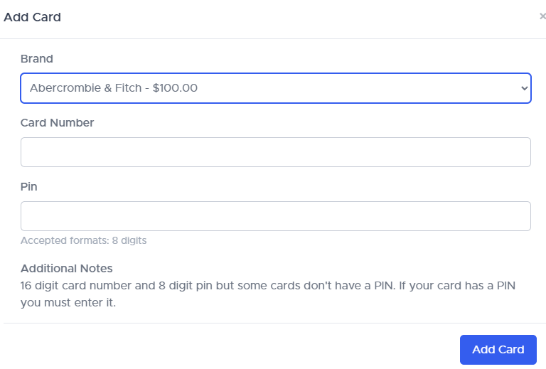 The brand dropdown contains only the options from the reservation you’re in. Once selected, we provide information about the format we’re looking for in the card number and PIN. If you’re having issues submitting please read these notes carefully and if you still can’t figure it out, open a help request.
