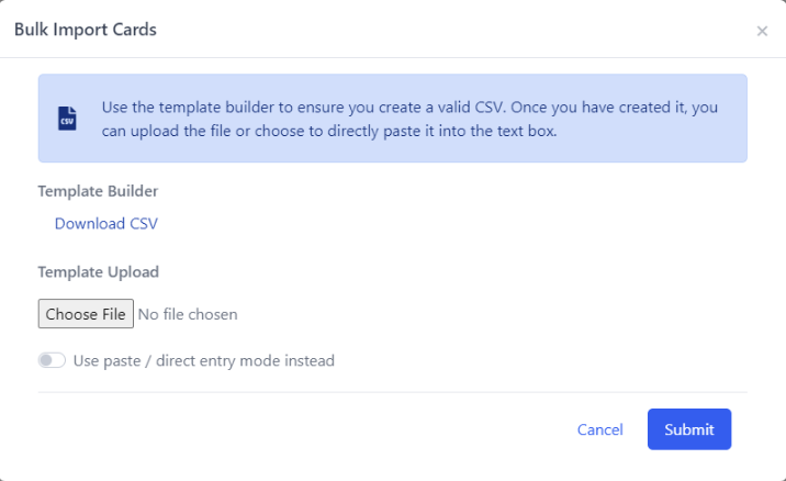 If you have a large number of cards to submit you will probably store them in a spreadsheet. We can accept spreadsheet uploads or copy/pasted submissions. Clicking the “Bulk Import” button inside a reservation will bring up the bulk import screen: